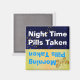 Um imã quadrado colorido feito como lembrete de medicação. O ímã é feito metade em azul escuro e metade em amarelo, com estrelas douradas e faíscas brancas no lado azul escuro e uma borboleta amarela ouro no lado oposto. O texto branco no lado azul diz Pílulas noturnas tomadas, e o sacudir e ele lê, Pílulas matinais tomadas, no lado amarelo do ímã. Torna muito mais fácil lembrar se você tomou seus remédios e um pequeno presente excelente para mais velho mais velhos que tendem a esquecer.
