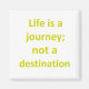 O ímã inspirador diz: "A vida é uma viagem, não um destino." Letras amarelas sobre fundo branco. Íman quadrado.