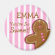 Um imã de Natal personalizável com um adorável homem de pão de gengibre com nariz e botões cor-de-rosa e glacé branco. Fundo listrado rosa e branco. Excelente estocante! Etiquetas de presentes coordenadas, cartões de nota, selos postais, papelaria e canecas também disponíveis! PinkInkArt original!