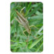 Este incrível ímã apresenta uma fotografia macro detalhada de um pequeno gafanhoto verde com marcas marrom manchadas sobre a grama. Na fotografia você pode ver os detalhes das pernas unidas, longas antenas e olhos pretos e dourados do gafanhoto.
