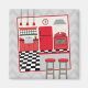 Um ímã de cozinha com ilustração de uma cozinha vermelha inspirada retroativamente com chão preto e branco. O fundo é cinza zigzag.
