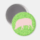Este ímã apresenta um porco rosa estilo cartoon. Tem a cabeça baixa pronta para engolir qualquer comida que encontrar. O fundo é uma mistura de diferentes tons de verde para criar a impressão de grama.