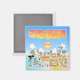 Um desenho do sul da Califórnia - mostrando Los Angeles, Anaheim, Long Beach, San Diego. Personagens de desenho animados de todos os tipos de natações e saltos e brincadeiras sob o brilhante sol da Califórnia brilhando acima de tudo.
