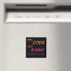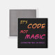 É Code Not Magic (Alguém Diga ao meu chefe) - um humor cínico embrulhado em um ímã para o seu quadro branco favorito. Texto laranja, vermelho e roxo sobre fundo preto.