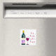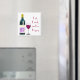 Um ímã quadrado bonito com gráficos de uma garrafa de vinho e de um copo de vinho com texto vermelho lendo, comendo, bebendo, e seja feliz. Bela ideia de presente, que não gosta de ímãs de geladeira.