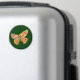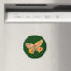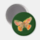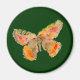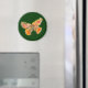 Um ímã circular verde profundo com um bonito motivo de borboleta em pinks e laranjas.