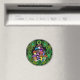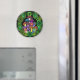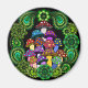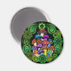 Um ímã com cogumelos psicodélicos coloridos cercado por paisley verde e mandalas verdes.