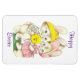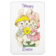 Adoráveis, vintage boy e bunnies de menina segurando uma flor amarela, estão representados neste ímã de Páscoa. Com mensagem, Felz pascoa, este ímã pode ser usado para decorar ou fazer um presente bonito!