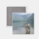 Cachorro malamute do Alaska andando em um lago com montanhas.