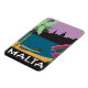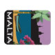 A ilustração original de Malta que celebra a ilha de Malta no Mar Mediterrâneo é modelada a partir dos posters do passado, ao estilo da viagens vintage. A imagem tropical de cor brilhante inclui a visão do horizonte de La Valetta e da Basilica, palmeira estilizada, flores de bougainvillea, e um barco pintado na água. O nome Malta está no fundo numa letra Deco em branco.