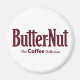 Íman redondo impresso com o logotipo do Café Manteiga-Nu marrom. 50% dos lucros destinam-se a ajudar a manter as pedras de cabeça históricas no Cemitério Prospect Hill de Omaha.