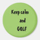 Para o jogador de golfe, colecionador de ímãs esportivos ou colecionador de ímãs: um ímã redondo verde, grande, de 3 polegadas, com a citação: "Mantenha a calma e o GOLF". Os ímãs estão disponíveis em outros materiais, formas e tamanhos. A citação pode ser personalizada em outros produtos e presentes Zazzle, incluindo t-shirts. Visite nossa loja Bsapparelplus. Obrigados para comprar conosco!