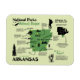 Mapa artístico do Arkansas, com todos os parques nacionais marcados, sucintamente descritos e ilustrados.