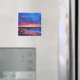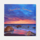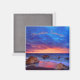 Belo pôr do sol tropical com tons de cor rosa e laranja num céu azul escuro turvo. Grandes rochas ficam na praia úmida de areia com reflexos da luz do sol na água do mar.
