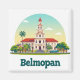 Vista colorida do edifício do governo colonial de Belmopan emoldurada por palmeiras, uma torre de telhado vermelho e um céu de pôr do sol quente. Ideal para temas de viagem, turismo, arquitetura e cidades caribenhas.