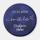 Uma Imã salve a data para seus convidados de casamento. Um fundo azul marinho, texto branco. A cor azul é irregular. Decorado com um pequeno coração. Personalize e adicione seus nomes e data de casamento.