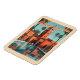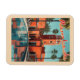 Um poster de viagens cativante do século médio mostrando a vibrante cidade de Marraquexe. Os icônicos edifícios de tijolos vermelhos e palmeiras são banhados à luz do sol quente, complementados por uma piscina e solários refrescantes ao ar livre. Matizes suaves de cor laranja, rosa, verde e azul realçam a cena, enquanto reflexões na água aumentam a profundidade e a tranquilidade.