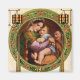 pintura ao estilo renascentista de madonna e criança com madonna vestindo um cachecol verde e laranja em seus ombros, cachecol branco e vermelho, e vestido mauve, segurando o cristo infantil vestido de azul e joseph está olhando para eles dentro a quadro redondo decorado com folhas sagradas e groselhas. belo quadro de natal com moldura decorada de natal com lanternas. arte cristã intage em verdes e castanhos.