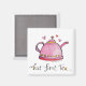 Este ímã de chá pode ser uma adorável adição à galeria de ímãs de geladeira de qualquer amante de chá. Eu escrevi à mão "Mas primeiro, chá" e ilustrei essas palavras com meu próprio bule de chá cor-de-rosa desenhado à mão, com vários corações minúsculos nas cores rosa e vermelho. O design, criado em papel com caneta, tinta e aquarela, tem uma aparência vintage com um toque de nostalgia. Este azulejo pode dar um toque caprichoso e fofo à sua cozinha ou sala de café da manhã.