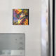 Pintura aquosa colorida, branca e vibrante, em cores vermelho vivo, castanho, amarelo, laranja, verde, com folha de ouro e prata.