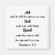 Este elegante íman Bíblia verso mostra uma passagem favorita de Escrituras de Matthew 7:7, o familiar verso Bíblia "Perguntar à Busca". Ele é escrito elegantemente em duas fontes que são fáceis de personalizar na Ferramenta Design no botão Editar este na página. É fácil personalizar alterando as fontes, a cor ou a cor de fundo para torná-la exclusivamente sua. "Pergunte e ele será dado a você; procure e você encontrará; bata e a porta será aberta para você."