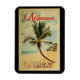 Um impressão de arte moderna Melbourne Florida, do século médio, exclusivamente retrógrado, no estilo de poster viagens vintage. Ele apresenta uma palmeira curva na praia arenosa com oceano sob um céu azul nublado.