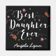 Linda caligrafia moderna em branco com palavras, "Melhor Filha Nunca." O design centra-se em sotaques florais e verdes coloridos sobre fundo preto. Espaço reservado para o nome personalizado da sua filha no centro inferior do design.