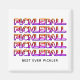 Simples "O Melhor Nunca Pickler PICKLEBALL Magnet" para homens e mulheres que adoram jogar picleball. A design mostra a palavra PICKLEBALL repetida em uma colorida tipografia esportiva. Por baixo do texto, diz BEST EVER PICKLER, que é PERSONALIZÁVEL para que você possa substituí-lo pelo seu nome, nome da equipe ou torneio, etc. Projetado para mães, pais e amigos que gostam de jogar ou assistir torneios regionais, nacionais e internacionais de piquete juntos. Comprar um para cada pessoa da sua equipe ou da sua família. Ou por que não comprar uma coleção de cores diferentes? Esse é o seu armário. Escolha entre uma seleção de designs de picleball por Designs Bereanos.