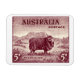O selo de 5 pence Merino Sheep de 1934 da Austrália. Um design filatélico excelente com um carneiro Merino visto numa paisagem australiana.