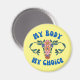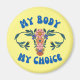 A imã de geladeira de arte de escolha profissional apresenta "o meu corpo à minha escolha" em texto azul de estilo retrô com gráfico uterus floral em fundo amarelo