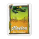 México em aventura! Vintage avião mexicano e cartoon paisagístico do deserto de poster de voo.
