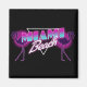Ilustração do design de texto "Miami Beach" com flamingos e decoração de triângulos em cores azuis, brancas e cor-de-rosa vibrantes em fundo de meio-tom