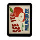 Um encantador ímã geladeira de viagens vintage Milwaukee Wisconsin, com uma adorável maçã vermelha, junto com um texto divertido e retrô que diz, "Veja você em Milwaukee"