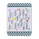 "Esta é a minha oração para vocês: conforto em dias difíceis, sorrisos quando a tristeza invade, arco-íris para seguir as nuvens, risos para beijar seus lábios, pôrs do sol para aquecer seu coração, abraços quando os espíritos sag, beleza para seus olhos verem, amizades para iluminar seu ser, fé para que você possa acreditar, confiança para quando você duvida, coragem para se conhecer, paciência para aceitar a verdade, amor para completar sua vida." Com um fundo azul / bolinhas verde na maioria dos produtos e roupa.