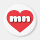 Este ímã apresenta um coração vermelho vibrante contendo as letras maiúsculas mn em letras maiúsculas, brancas e arredondadas, uma abreviação lúdica para Minnesota, o estado do norte da estrela.