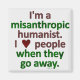 Esta design engraçada, feita para pessoas que não gostam de estar ao redor de outras pessoas, diz, "Sou um humanista misantropico. Eu adoro pessoas quando elas vão embora." É perfeito para os solitários/introvertidos que não gostam ou se dão bem com outros humanos... mas que também ama esses outros humanos (quando eles vão embora, é claro). Então, é para misantropos, pessimistas e cínicos. Diga a todos o quão negativo você é!