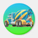 Um crachá de betão listrado azul e amarelo, um grande caminhão de construção.
