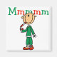 Um design de camiseta de Natal com uma figura de palitos, uma criança comendo uma cana doce e um texto vermelho e verde que diz "Mmmm".