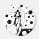 Ilustração Vintage arte deco design com uma moça de chico vestida de chapéu e casaco e carregando de bolsa. A mulher está caminhando por um caminho flutuante. Bolinhas, círculos ou bolhas pretas estão flutuando. O fundo está claro para que você possa adicionar qualquer cor que quiser! Clique no botão "personalizar"!