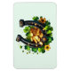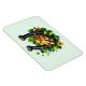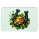 Um ímã flexível com uma Rua. Imagem temática do Dia de Patrick. Uma ferradura preta e dourada sentada numa cama de trevo verde com moedas de ouro brilhante.
