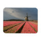 Imã fotográfico retangular com uma paisagem com moinho de vento e flores de tulipas cor-de-rosa em filas sobre uma fazenda de bolbo sob um céu de cinza no campo dos Países Baixos em primavera.