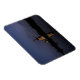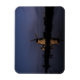 Fotografia retangular de souvenir com moinhos de vento históricos iluminados com reflexo na água do rio durante a Hora Azul no início da noite em Kinderdijk, nos Países Baixos.