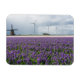 Magneta de Souvenir com paisagem com moinho de vento tradicional e várias moinhos de vento modernos para gerar energia verde atrás de um campo com flor de hyacinto roxa na Região Bulb, na Holanda.