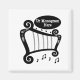 Uma escala de cinza harpa com 5 cordas. As notas musicais negras estão no fundo, e o texto pode mudar no topo.
