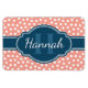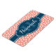 Na moda, rosa claro de tendência e padrão de pontos brancos no fundo, revestidos com um rótulo azul escuro com um nome personalizável e modelo de monograma.
