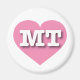 Este ímã apresenta um coração cor-de-rosa vibrante contendo as letras maiúsculas, brancas e em negrito MT, a abreviação oficial para Montana, o estado do tesouro.