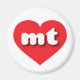 Este ímã apresenta um coração vermelho vibrante contendo as letras maiúsculas mt, brancas, arredondadas e em negrito, uma abreviação lúdica para Montana, o estado do tesouro.