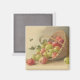 Uma ilustração de um cesto mais wicker com groselhas vermelhas e verdes se espalhando e uma abelha ou vespa voando acima, em um fundo creme escuro ou bege, de uma pintura de safra pela artista Catharina ou Catherine Klein, nascer 1861.