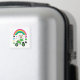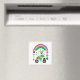 Um cachorro giro numa moto rodeado por um arco-íris e estrelas coloridas, design para crianças