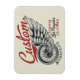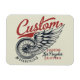 Esta design mostra uma roda com uma asa com o texto Custom Motorcycle, Pasadena Los Angeles California